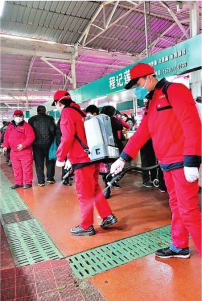 據《武漢晚報》21日報道,19日,專業人員已經開始對武漢市青山區三興農貿市場進行消毒。