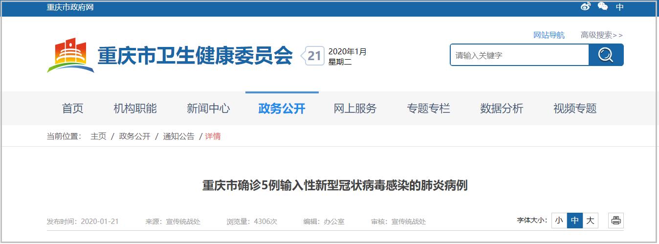 據重慶衞生健康委網站消息,1月21日晚,國家衞生健康委確認重慶市首例輸入性新型冠狀病毒感染的肺炎確診病例。患者為44歲女性,巫山縣人, 1月15日自武漢返回巫山縣後,因發熱、乏力等症狀,於當日在巫山縣一發熱門診就診後即被收治入院隔離治療。經重慶市疾控部門檢測,患者標本呈新型冠狀病毒核酸陽性。1月20日,將標本送中國疾控中心進行核酸檢測複核為陽性。1月21日,經國家衞生健康委疫情領導小組下設的診斷組專家評估確認為新型冠狀病毒感染的肺炎確診病例。現患者體温正常,生命體徵平穩,密切接觸者正在醫學觀察。