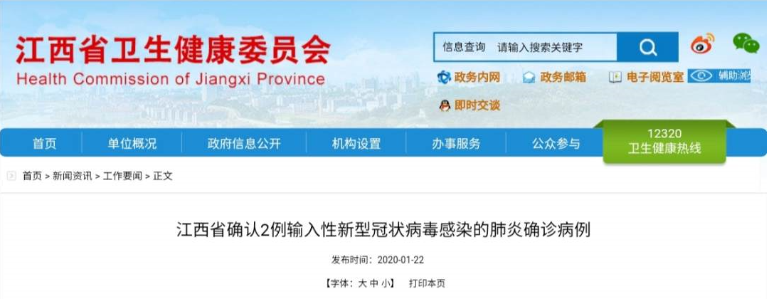 據江西省衞生健康委通報22日凌晨通報,1月21日,國家衞生健康委確認江西省首例輸入性新型冠狀病毒感染的肺炎確診病例。