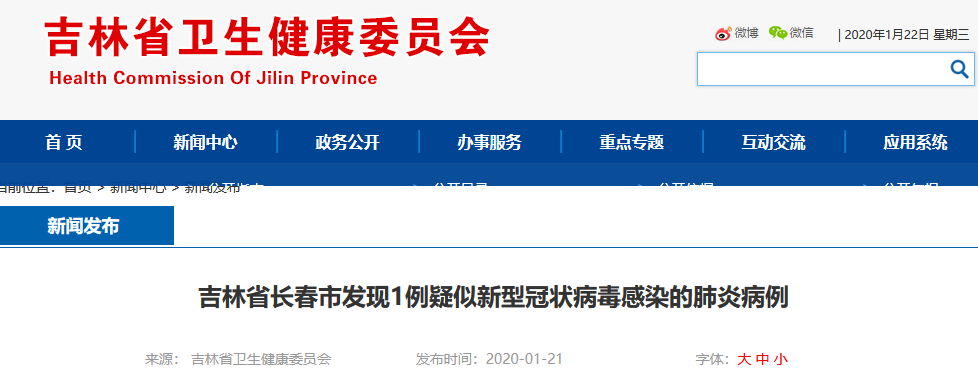 1月21日,吉林省衞生健康委員會網站發佈通報,吉林省長春市發現1例疑似新型冠狀病毒感染的肺炎病例。