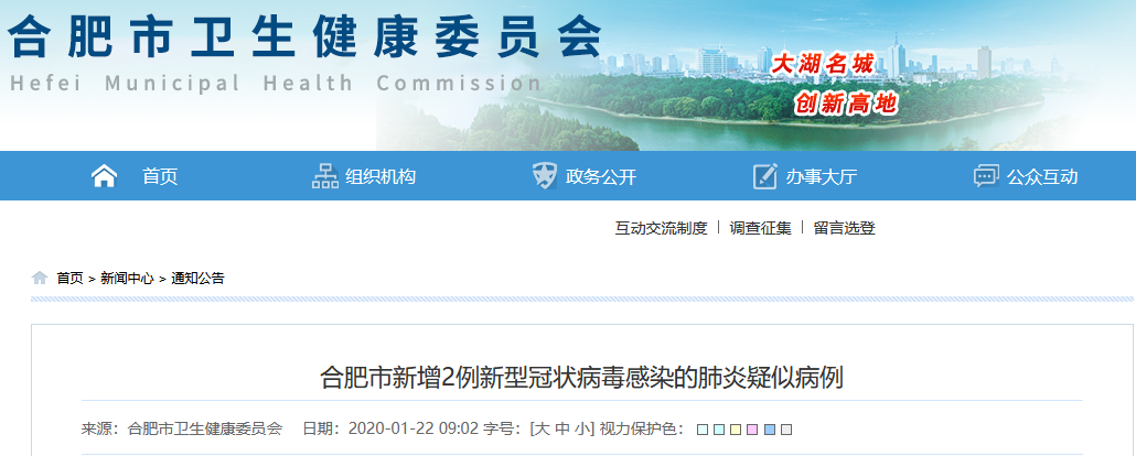 合肥市衞生健康委員會官網1月22日發佈通報《合肥市新增2例新型冠狀病毒感染的肺炎疑似病例》。