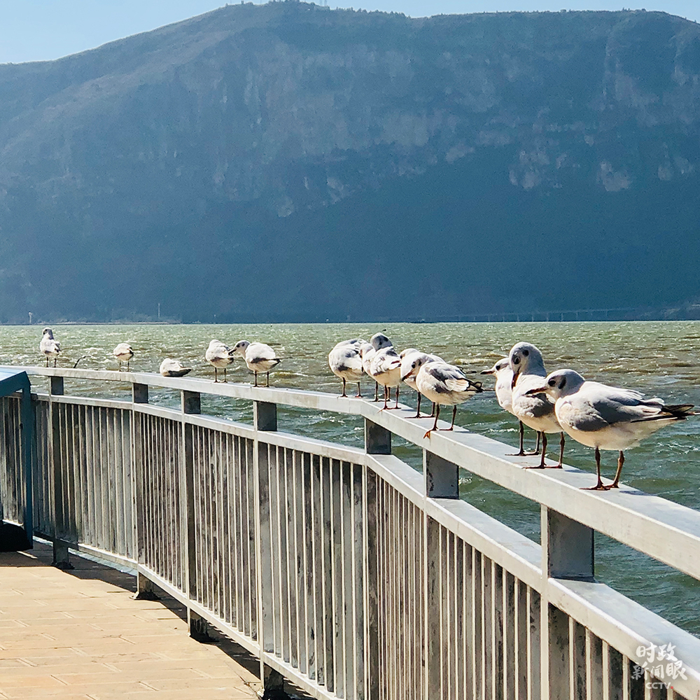 △海鷗臨時在滇池眺望台休息,一片寧靜。(總枱央視記者彭漢明拍攝)