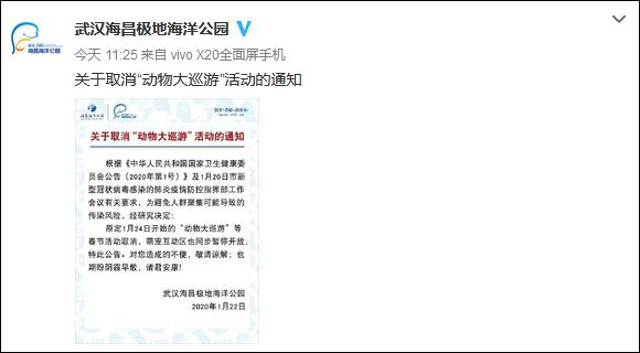(觀察者網訊)今天(1月22日),@武漢海昌極地海洋公園 官方微博發佈關於取消“動物大巡遊”活動的通知。