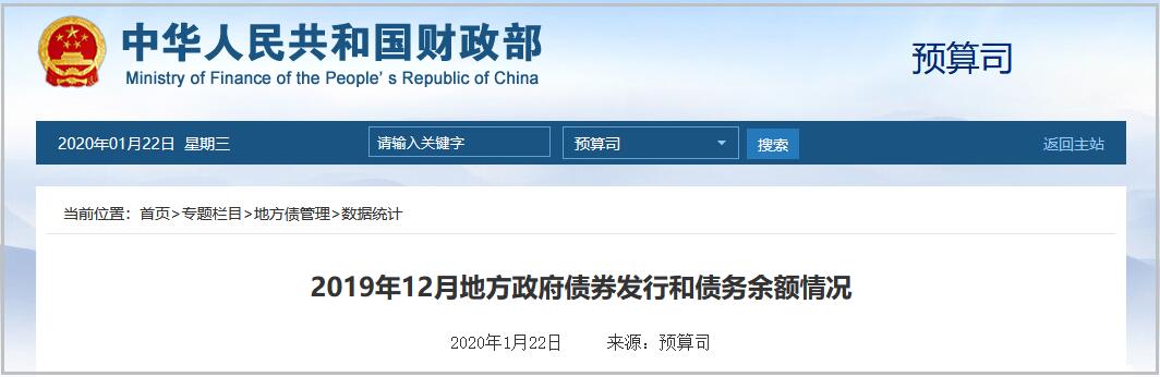 財政部預算司1月22日發佈了2019年12月地方政府債券發行和債務餘額情況,稱截至2019年12月末,全國地方政府債務餘額213072億元,控制在全國人大批准的240774.3億元限額內。