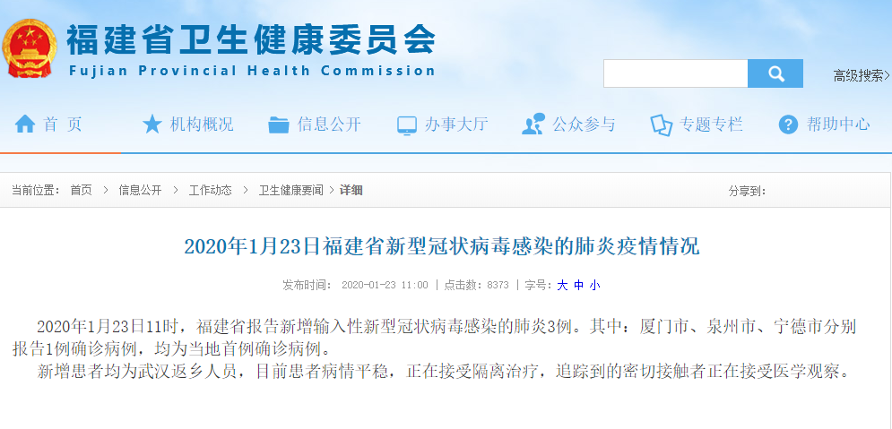 據福建省衞生健康委員會官網消息,2020年1月23日11時,福建省報告新增輸入性新型冠狀病毒感染的肺炎3例。其中:廈門市、泉州市、寧德市分別報告1例確診病例,均為當地首例確診病例。
