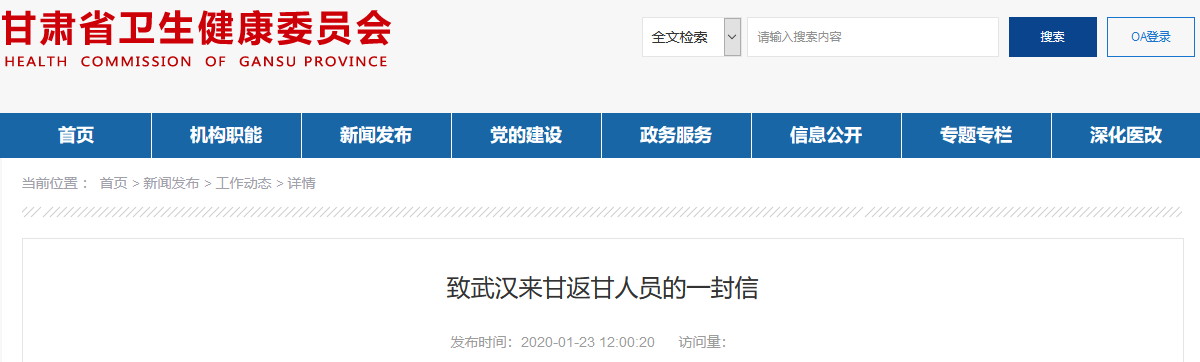 甘肅省衞生健康委員會網站1月23日發佈《致武漢來甘返甘人員的一封信》,請武漢來甘返甘人員主動居家隔離14天,14天內不要走親訪友、不與外人接觸。14天后如無症狀可解除隔離。以下為全文:
