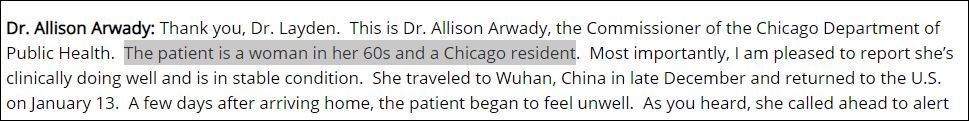 該患者是一名60多歲的婦女,她去年12月下旬前往武漢,並於1月13日返回芝加哥。她在抵達芝加哥幾天後才發病,所以官員們認為她返程航班上的其他人不會有太大的感染風險。