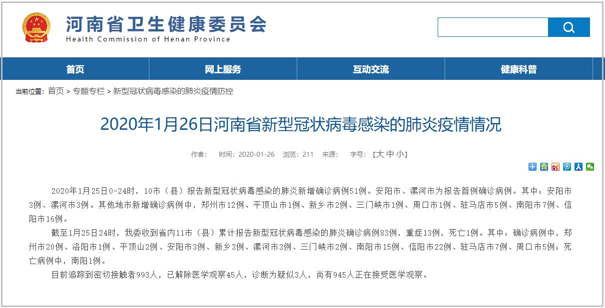 截至1月25日24時,我委收到省內11市(縣)累計報告新型冠狀病毒感染的肺炎確診病例83例,重症13例,死亡1例。其中:確診病例中,鄭州市20例、洛陽市1例、平頂山2例、安陽市3例、新鄉3例、漯河市3例、三門峽市2例、南陽市15例、信陽市22例、駐馬店市7例、周口市5例;死亡病例中,南陽1例。