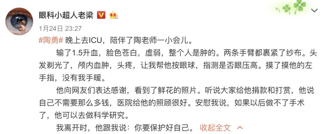 據@眼科小超人老梁 此前在微博透露,陶勇醫生目前依然虛弱,在醫院受到了良好的照顧……他還説,如果以後做不了手術了,他可以去做科學研究。