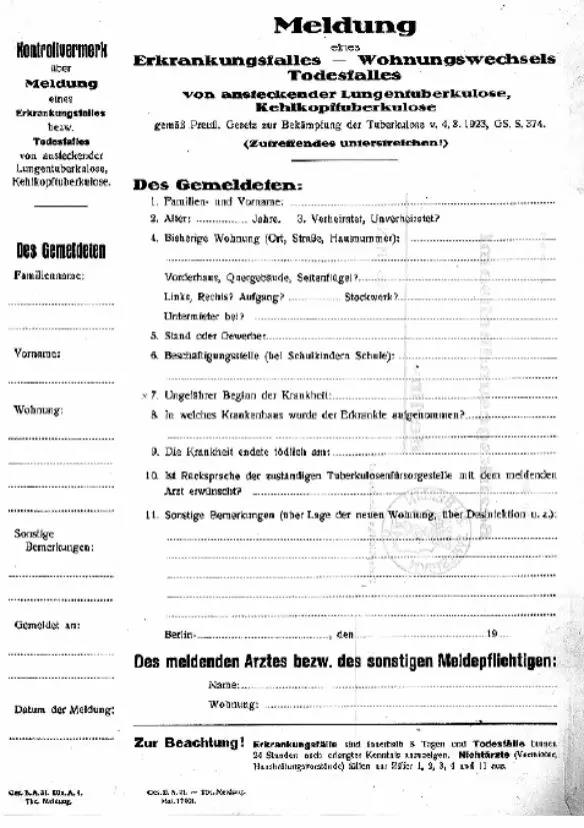(根據《普魯士抗擊結核法》製作的患者情況登記表格)