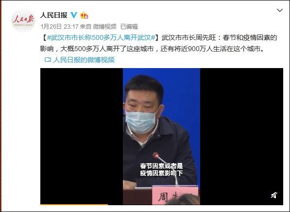 據@人民日報 報道,武漢市委副書記、市長周先旺在新聞發佈會上表示,春節和疫情因素的影響,大概500多萬人離開了這座城市,還有將近900萬人生活在這個城市。