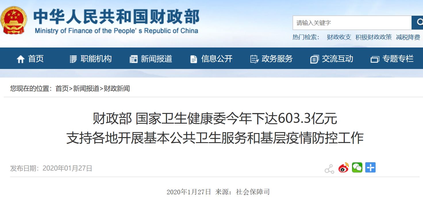 財政部、國家衞健委:今年下達603.3億元, 支持各地疫情防控等