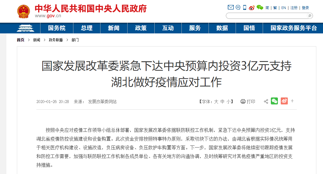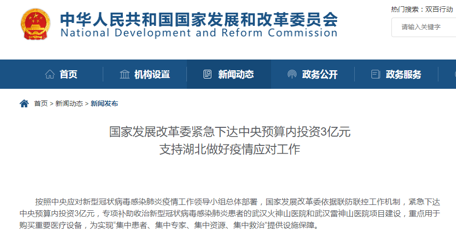 1月26日,國家發展改革委發佈《國家發展改革委緊急下達中央預算內投資3億元支持湖北做好疫情應對工作》通知,按照中央應對新型冠狀病毒感染肺炎疫情工作領導小組總體部署,國家發展改革委依據聯防聯控工作機制,緊急下達中央預算內投資3億元,專項補助收治新型冠狀病毒感染肺炎患者的武漢火神山醫院和武漢雷神山醫院項目建設,重點用於購買重要醫療設備,為實現“集中患者、集中專家、集中資源、集中救治”提供設施保障。