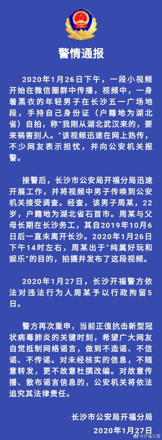 2020年1月27日,長沙開福警方依法對違法行為人周某予以行政拘留5日。