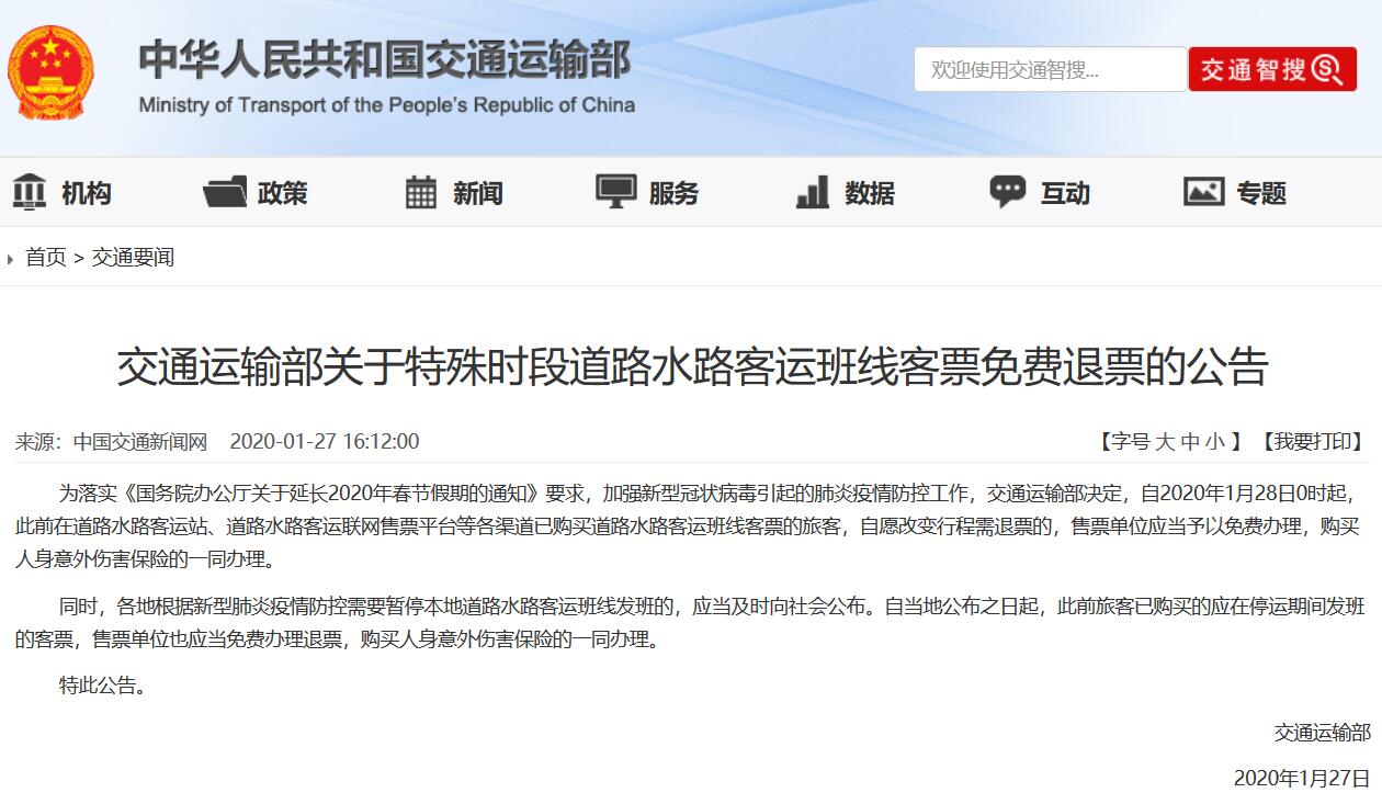 據交通運輸部網站1月27日消息,為落實《國務院辦公廳關於延長2020年春節假期的通知》要求,加強新型冠狀病毒引起的肺炎疫情防控工作,交通運輸部決定,自2020年1月28日0時起,此前在道路水路客運站、道路水路客運聯網售票平台等各渠道已購買道路水路客運班線客票的旅客,自願改變行程需退票的,售票單位應當予以免費辦理,購買人身意外傷害保險的一同辦理。