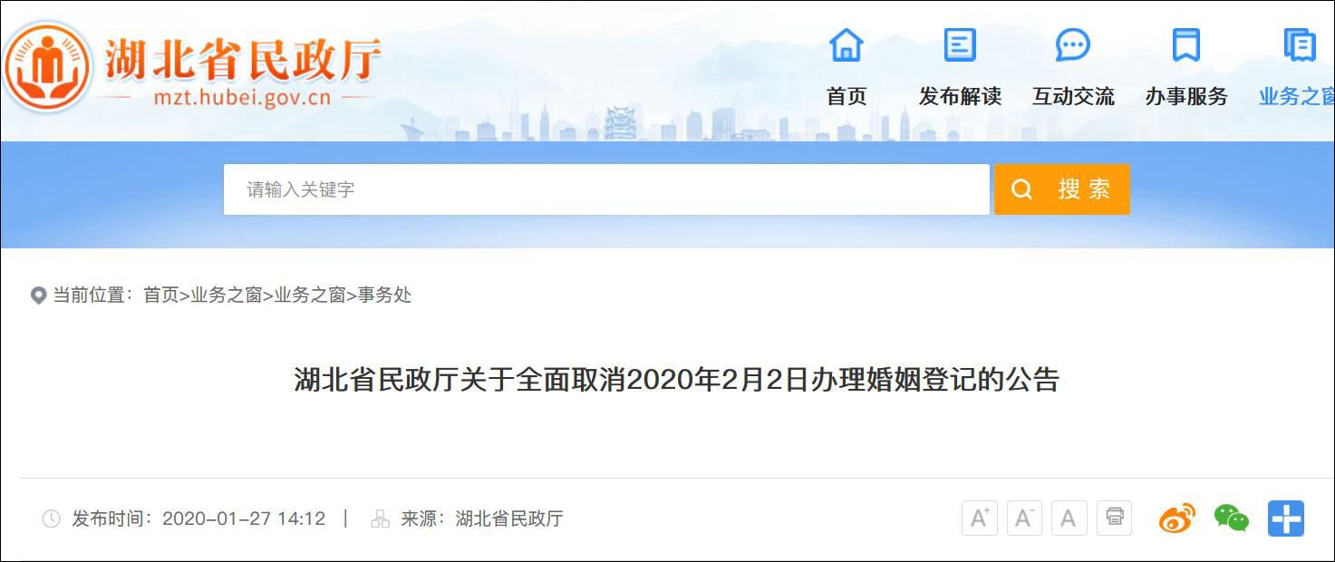 湖北省民政廳網站1月27日發佈公告,稱鑑於全省目前嚴峻的疫情,根據《國家突發公共衞生事件應急預案》規定,按照湖北省應對新型冠狀病毒感染肺炎疫情防控指揮部的相關要求,湖北省民政廳決定在全省範圍內取消2020年2月2日辦理婚姻登記事宜。