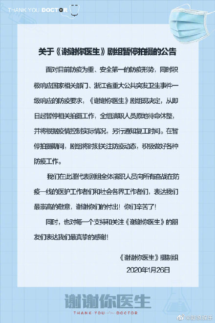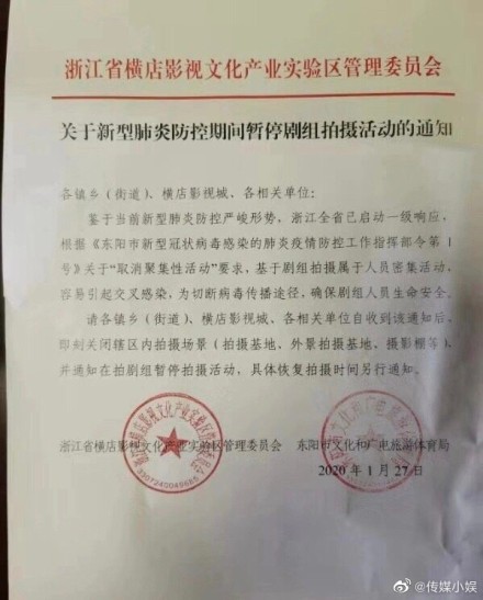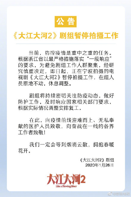 中新網客户端1月27日電(袁秀月) 記者獲悉,受疫情影響,以及響應國家相關部門、浙江省重大公共突發衞生事件一級響應的防疫要求,多部電視劇宣佈暫停拍攝。其中包括趙麗穎、王一博的《有翡》,王凱、楊爍、董子健的《大江大河2》,楊冪、白宇的《謝謝你醫生》,電視劇《傳家》《迴廊亭》等。另有消息稱,橫店影視城已暫停劇組拍攝。25日起,橫店影視城各景區已暫停對外開放。