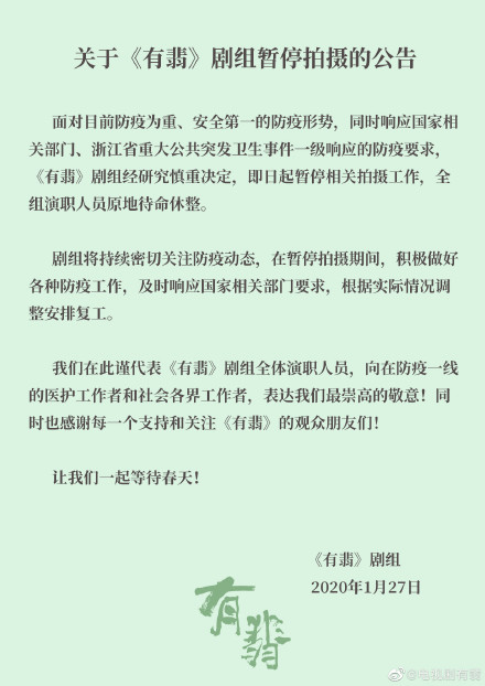 橫店影城暫停對外開放,《有翡》等多部電視劇停拍