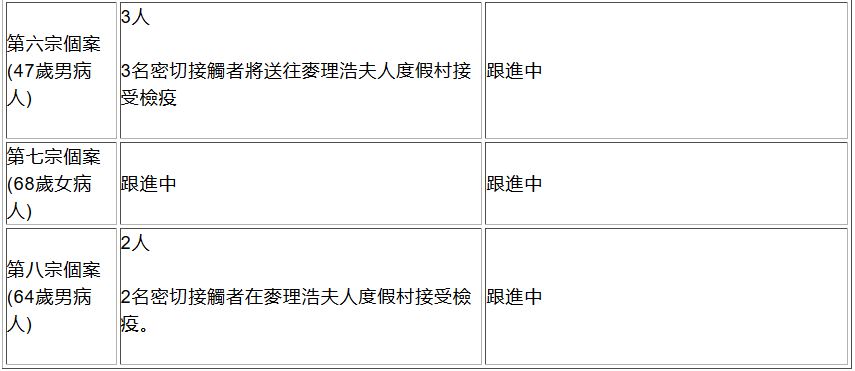 就香港八宗輸入的確診個案,衞生防護中心正繼續進行流行病學調查及進行接觸者追蹤的工作。截至昨日晚上八時,接觸者追蹤的進度如下: