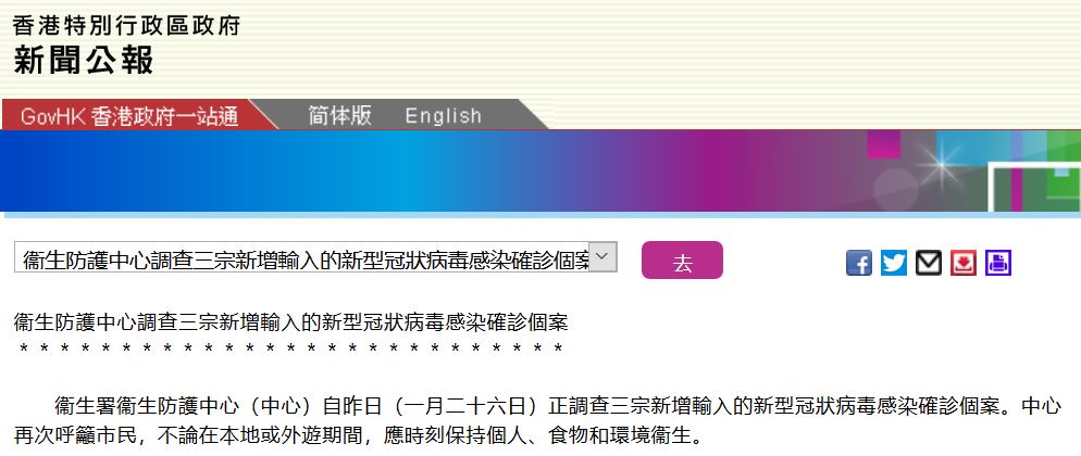 1月27日凌晨,香港特區政府新聞網站發佈新聞公報稱,香港衞生署衞生防護中心自昨日(26日)正調查3宗新增輸入的新型冠狀病毒感染確診病例。並稱,香港累計有8宗輸入的確診病例。