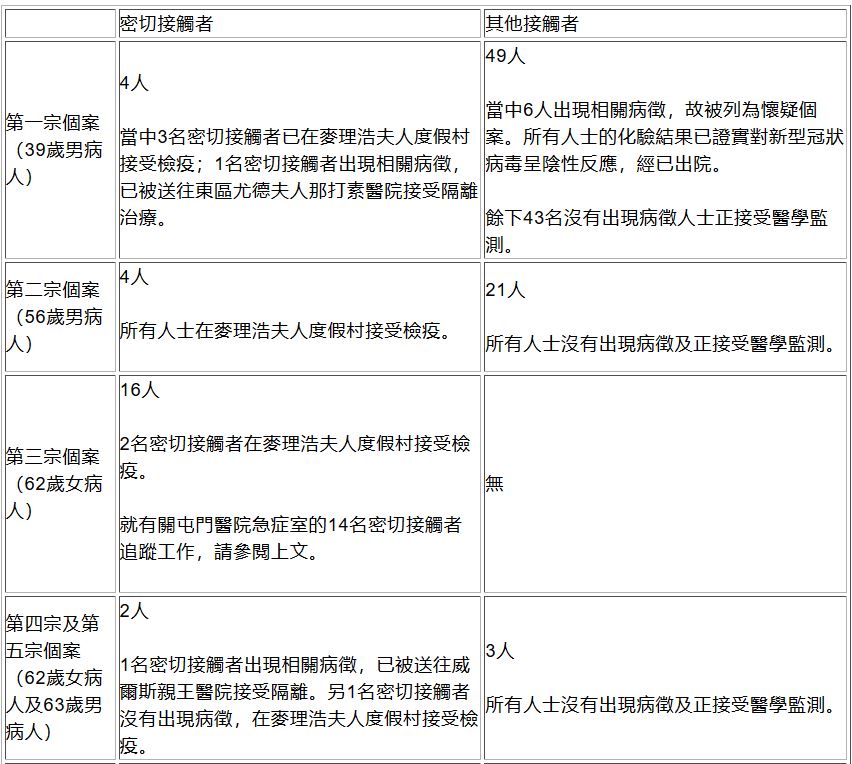 衞生防護中心已即時展開流行病學調查及進行接觸者追蹤的工作。根據病人提供的資料,他潛伏期內曾於武漢市武昌區白沙洲一菜市場工作,沒有接觸野生動物。初步調查顯示,病人的妻子及女兒沒有出現病徵,將被送往麥理浩夫人度假村接受隔離監測。