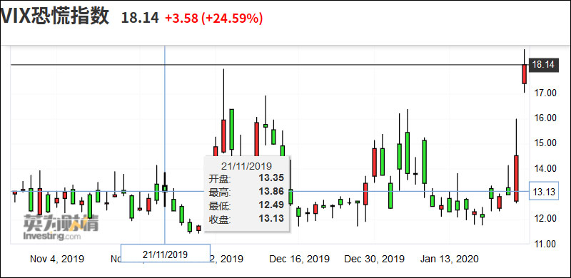俗稱“恐慌指數”的VIX波動指數暴漲24.6%,報18.14點(最高漲幅一度高達26.85%),為2019年10月以來新高,顯示市場情緒不穩。