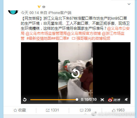 此前,有網友舉報稱,義烏當地有假冒口罩流入市場。義烏市市場監督管理局官方微博@義烏市市場監督管理局 26日通報稱:1月25日接網友舉報,本地有假冒口罩即將流入市場,義烏市市場監督管理局立即聯合公安部門前往該地點開展檢查,目前調查仍在進行中。對於發現有涉及疫情的違法行為,義烏市市場監督管理局將從嚴查處並向社會及時公佈。