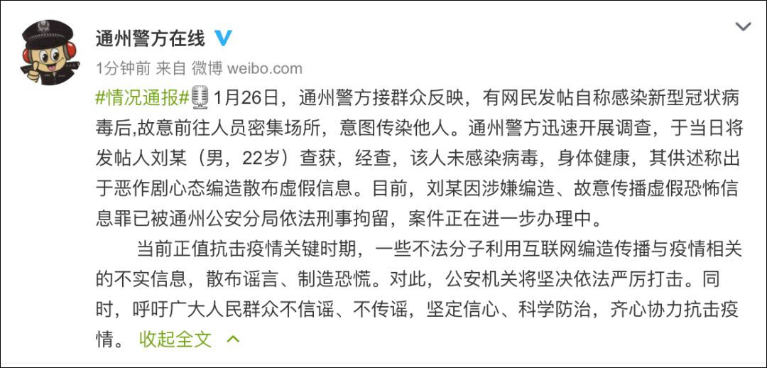 1月26日,通州警方接羣眾反映,有網民發帖自稱感染新型冠狀病毒後,故意前往人員密集場所,意圖傳染他人。通州警方迅速開展調查,於當日將發帖人劉某(男,22歲)查獲,經查,該人未感染病毒,身體健康,其供述稱出於惡作劇心態編造散佈虛假信息。