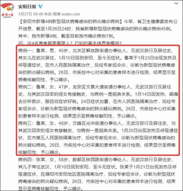 截至1月27日24時,河南省安陽市確診新型冠狀病毒肺炎病例11例。據東方今報·猛獁新聞報道,確診病例中5人系親戚關係,均無武漢旅行及居住史,其中3人與從武漢居住回來的女子有接觸史,3人分別是該女子的父親和2個姑姑,而該女子目前無症狀。