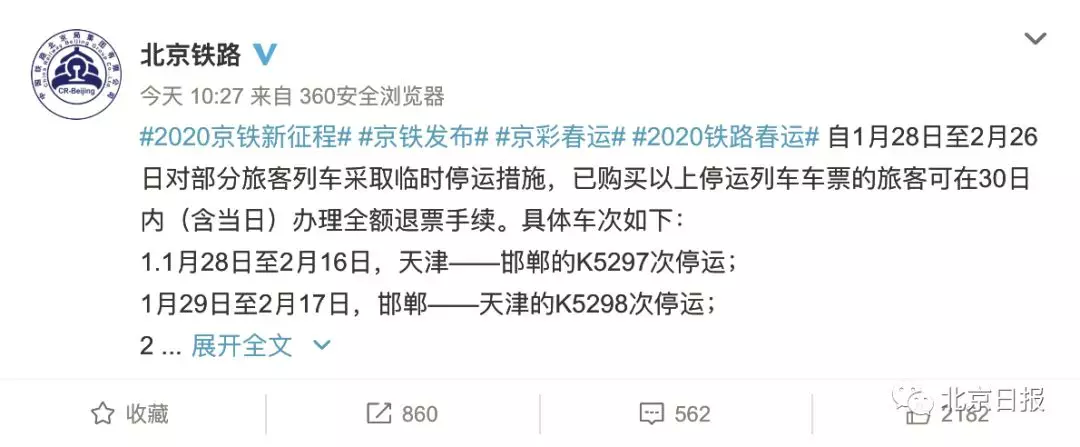 據中國鐵路北京局集團有限公司消息,自1月28日至2月26日對部分旅客列車採取臨時停運措施。