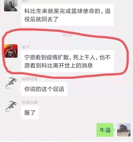 “寧願疫情死千人不願科比死”,已拘留! 2020-01-28 1月27日,江蘇徐州。網友“剛子”在微信羣發言稱“寧願疫情擴散,死上千人,也不願看到科比離開世上的消息”。當日,“剛子”涉嫌尋釁滋事被徐州警方行政拘留7日。 網傳截圖