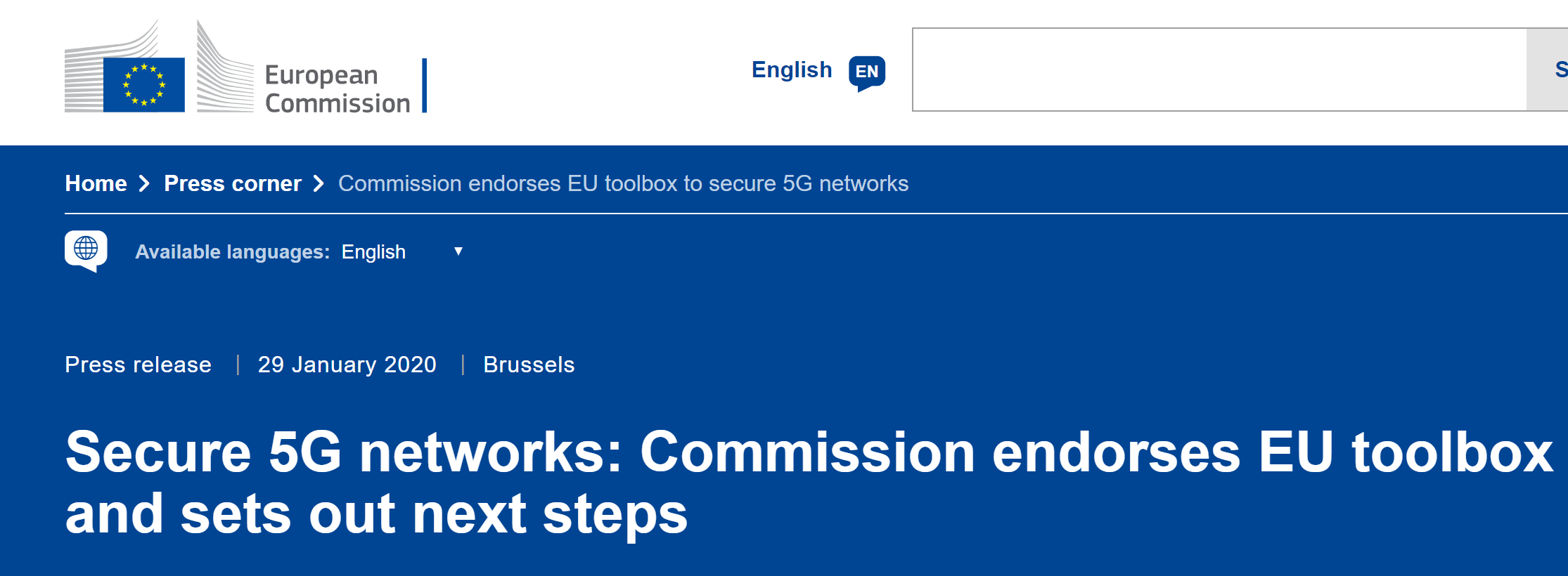 歐盟數字專員蒂埃裏·布雷頓(Thierry Breton)表示,歐盟會建立安全的5G網絡,同意加強安全要求,但不會明確禁止任何廠商。