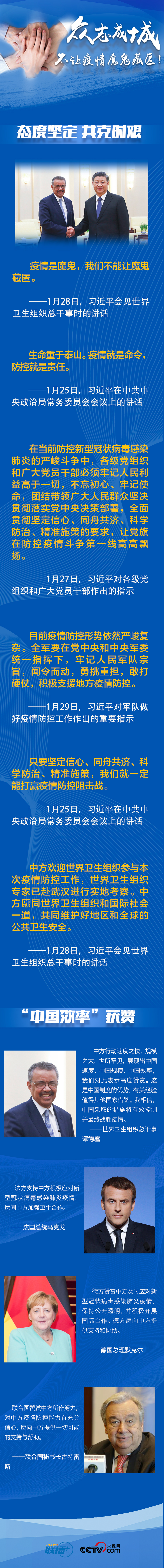 央視網1月30日報道,1月28日,國家主席習近平在人民大會堂會見世界衞生組織總幹事譚德塞。習近平在會見中指出:“疫情是魔鬼,我們不能讓魔鬼藏匿。”第二天,習近平又對軍隊做好疫情防控工作作出重要指示指出:“全軍要在黨中央和中央軍委統一指揮下,牢記人民軍隊宗旨,聞令而動,勇挑重擔,敢打硬仗,積極支援地方疫情防控。”