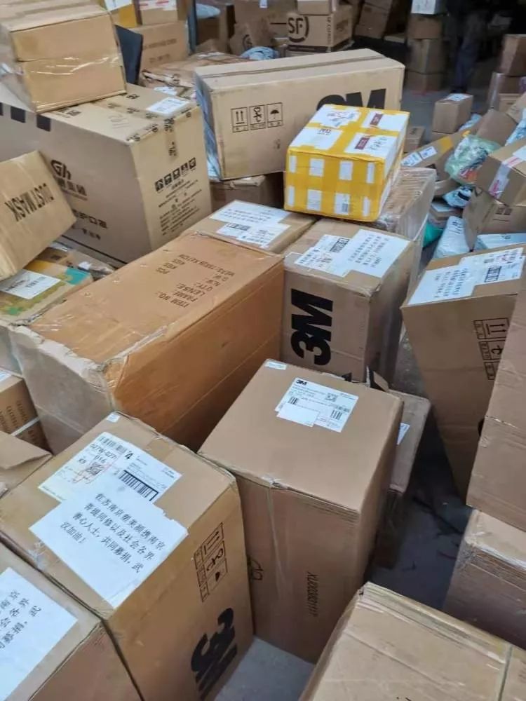 在這家快遞點內,地面堆放着數十個大小不一的紙盒,全是送往五醫院的快遞。 這些快遞基本上都是社會愛心人士向醫院捐贈的醫護用品,包括口罩、護目鏡、頭套、鞋套等。 五醫院工作人員介紹,近段時間,他們每天都會收到大量捐贈的醫護用品。