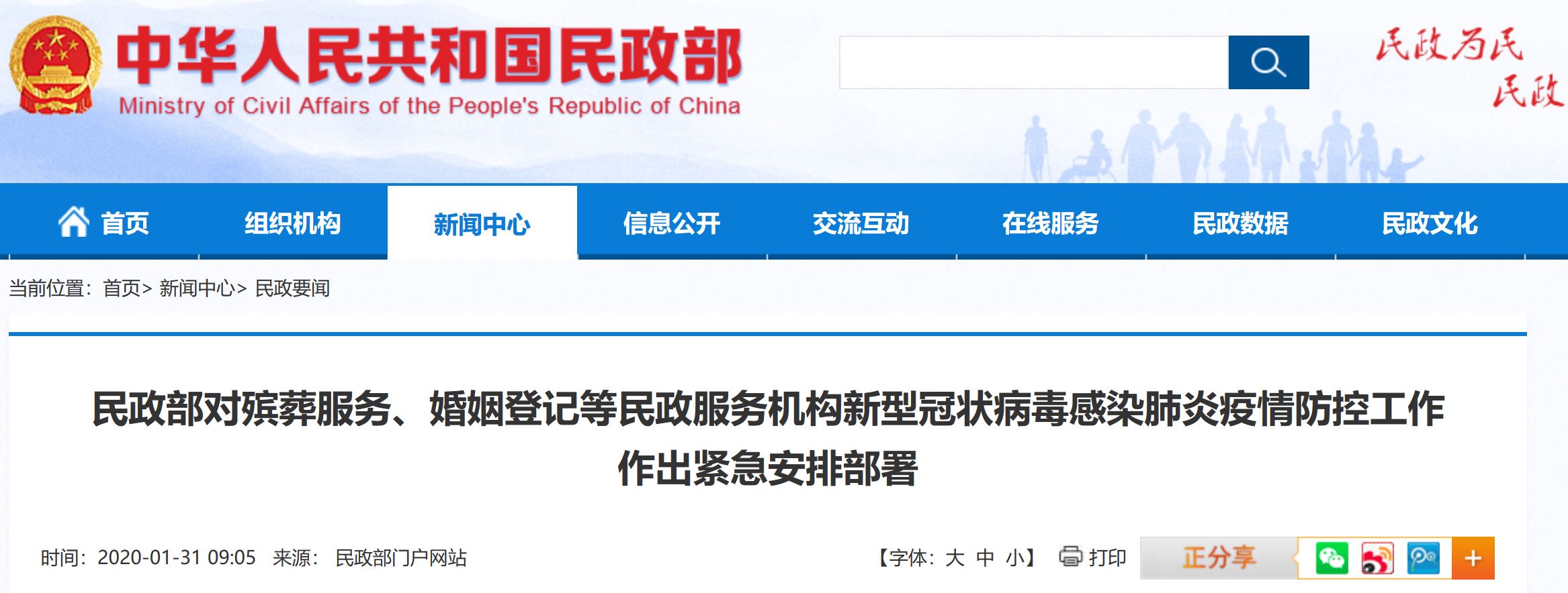 1月31日,民政部網站發佈通告:1月30日,民政部辦公廳印發《關於切實做好殯葬服務、婚姻登記等服務機構新型冠狀病毒感染肺炎疫情防控工作的緊急通知》,對殯葬服務機構、婚姻登記機關、流浪乞討人員救助管理機構和精神衞生福利機構等社會事務領域民政服務機構疫情防控工作做出部署。