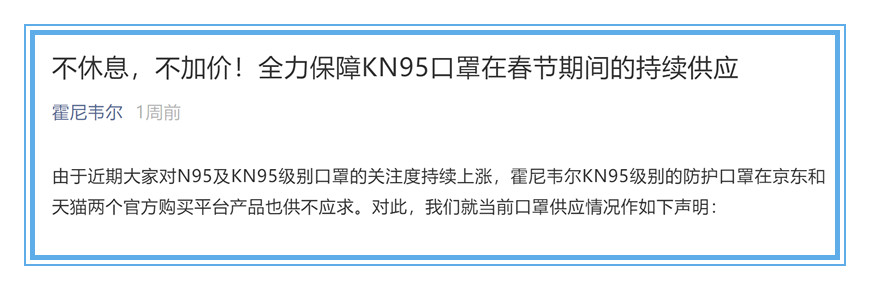 該公司當時宣佈:“不休息,不加價,全力保障KN95口罩在春節期間的持續供應。”
