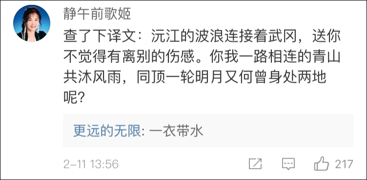 “青山一道同雲雨,明月何曾是兩鄉”,這句詩出自王昌齡的七言絕句《送柴侍御》,其中藴涵的正是人分兩地、情同一心的深情厚誼,用在此處不可謂不恰當。