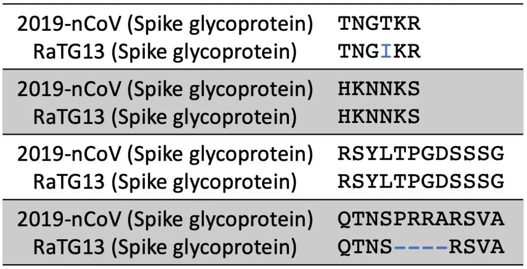 於是,他們用這次新型冠狀病毒的刺突糖蛋白(Spike glycoprotein)序列和SARS病毒的同源蛋白進行了一下比對。然後發現2019-nCoV的刺突糖蛋白比SARS病毒的同源蛋白上多出來了4個獨立的短肽段(6-12個氨基酸左右)。作者由此指出,多出來的4個短肽段是2019-nCoV獨有的,其他冠狀病毒沒有。