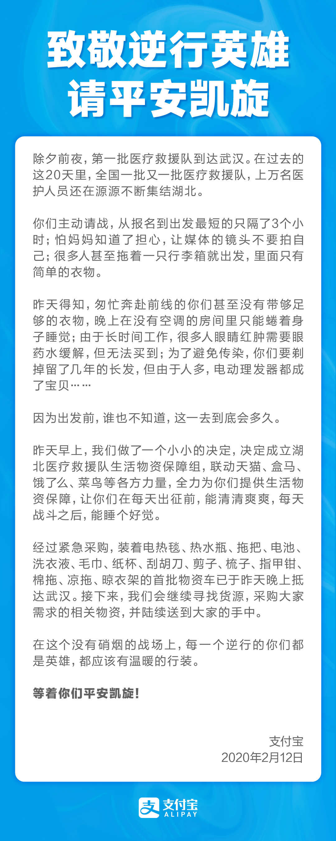 (文/觀察者網 一鳴)支付寶2月12日發佈公開信,宣佈成立湖北醫療救援隊生活物資保障組,聯動阿里巴巴體系內的淘寶、天貓、口碑、餓了麼等各方力量進行採購和配送,為援鄂醫療隊解決生活物資緊缺問題,重點保障保暖和生活必需品兩類物資。