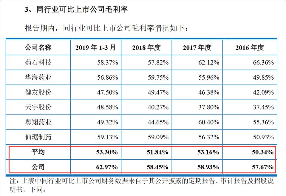 招股書顯示,盈利能力方面,上述可比上市公司2016-2018年前三季度毛利率均值為50.34%、53.16%和50.82%;博瑞醫藥2016-2018年毛利率為57.67%、58.93%和58.45%,略高於前者平均水平。