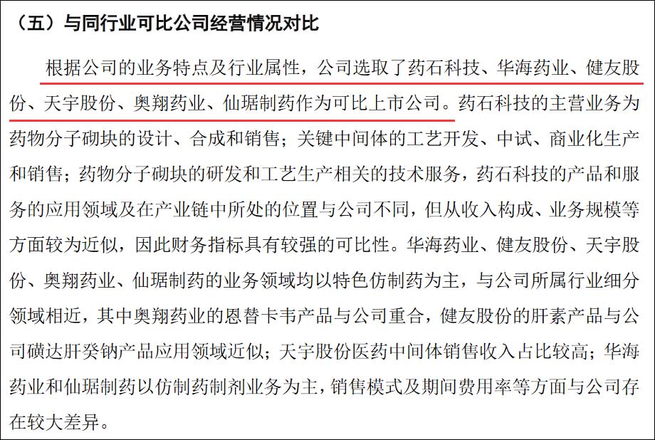 除此之外,招股書中介紹,根據公司的業務特點及行業屬性,博瑞醫藥選取了藥石科技、華海藥業、健友股份、天宇股份、奧翔藥業、仙琚製藥作為可比上市公司。
