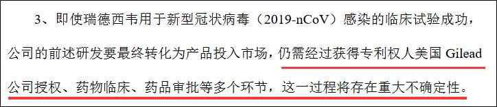 因此,博瑞醫藥在上述公告中提到:“該藥物對於新型冠狀病毒(2019-nCoV)感染是否有效存在重大不確定性。如果相關臨牀試驗結果不理想,則瑞德西韋的仿製技術就無重大價值可言。”