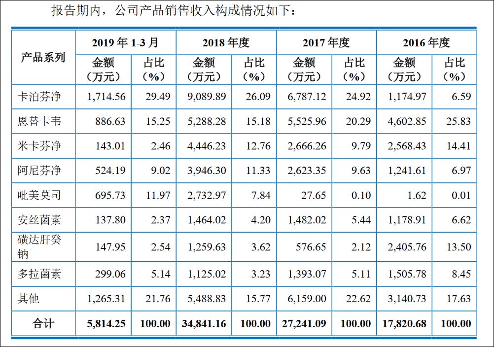 其中產品銷售收入主要來源於卡泊芬淨、米卡芬淨、阿尼芬淨、吡美莫司、恩替卡韋、多拉菌素等仿製藥產品;技術收入除來源於上述仿製藥產品外,還包括自主開發的創新藥產品。