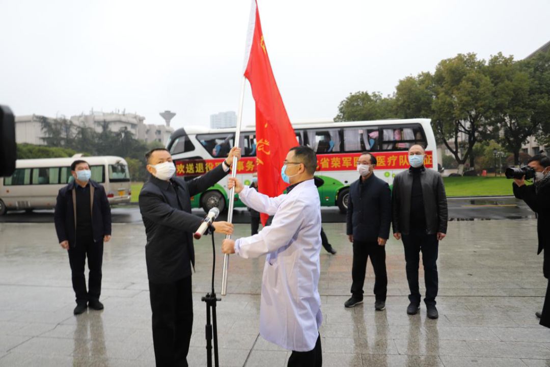 退役軍人事務部擁軍優撫司負責人代表部領導作出徵動員,隨後,他將一面鮮豔的紅旗,鄭重授予醫療隊……