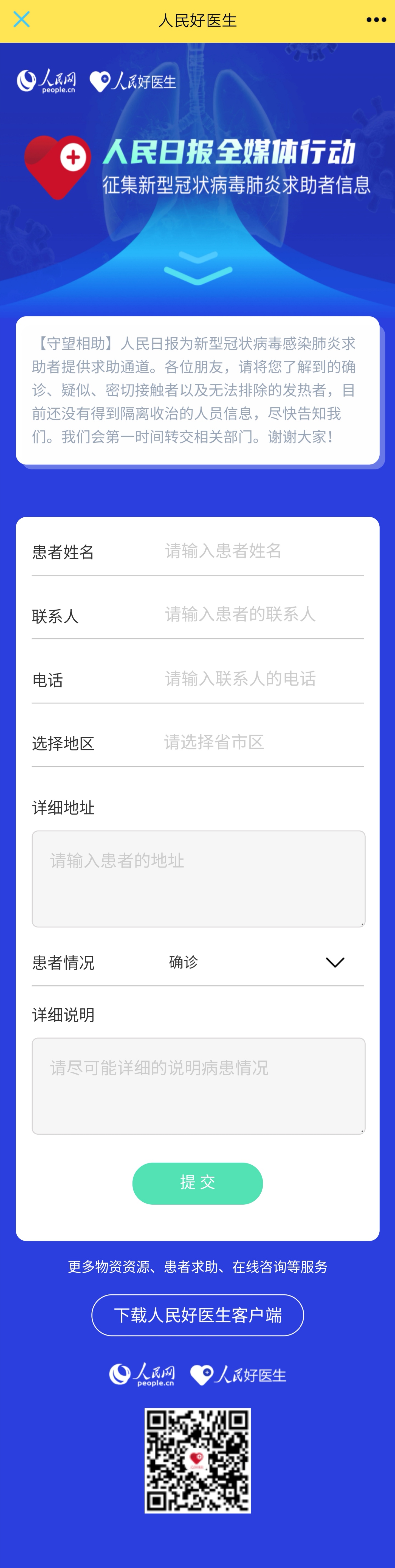 新型冠狀病毒肺炎求助者信息徵集 None 2020-02-12 人民日報全媒體行動:新型冠狀病毒肺炎求助者信息徵集入口:https://hys.people-health.cn/m/#/pages/ncovSuff/index