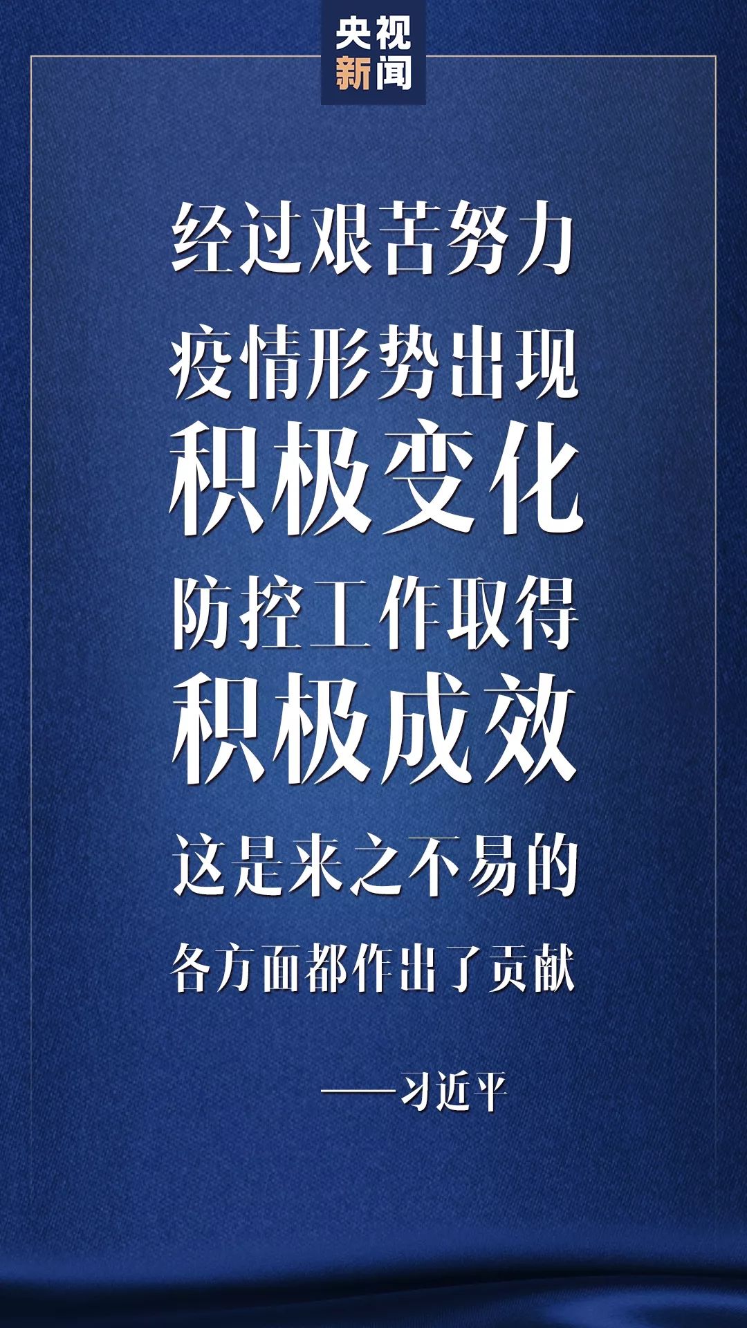對於當前的疫情形勢,習近平指出,經過艱苦努力,疫情形勢出現積極變化,防控工作取得積極成效。這是來之不易的,各方面都作出了貢獻。