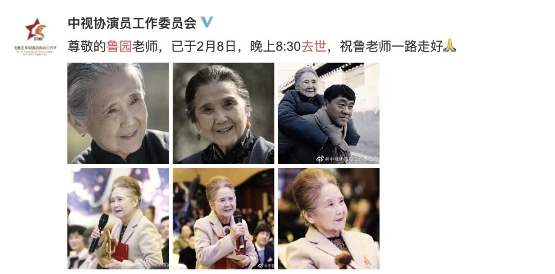 2月12日晚,中視協演員工作委員會發布訃告“尊敬的魯園老師,已於2月8日,晚上8:30去世,祝魯老師一路走好”。