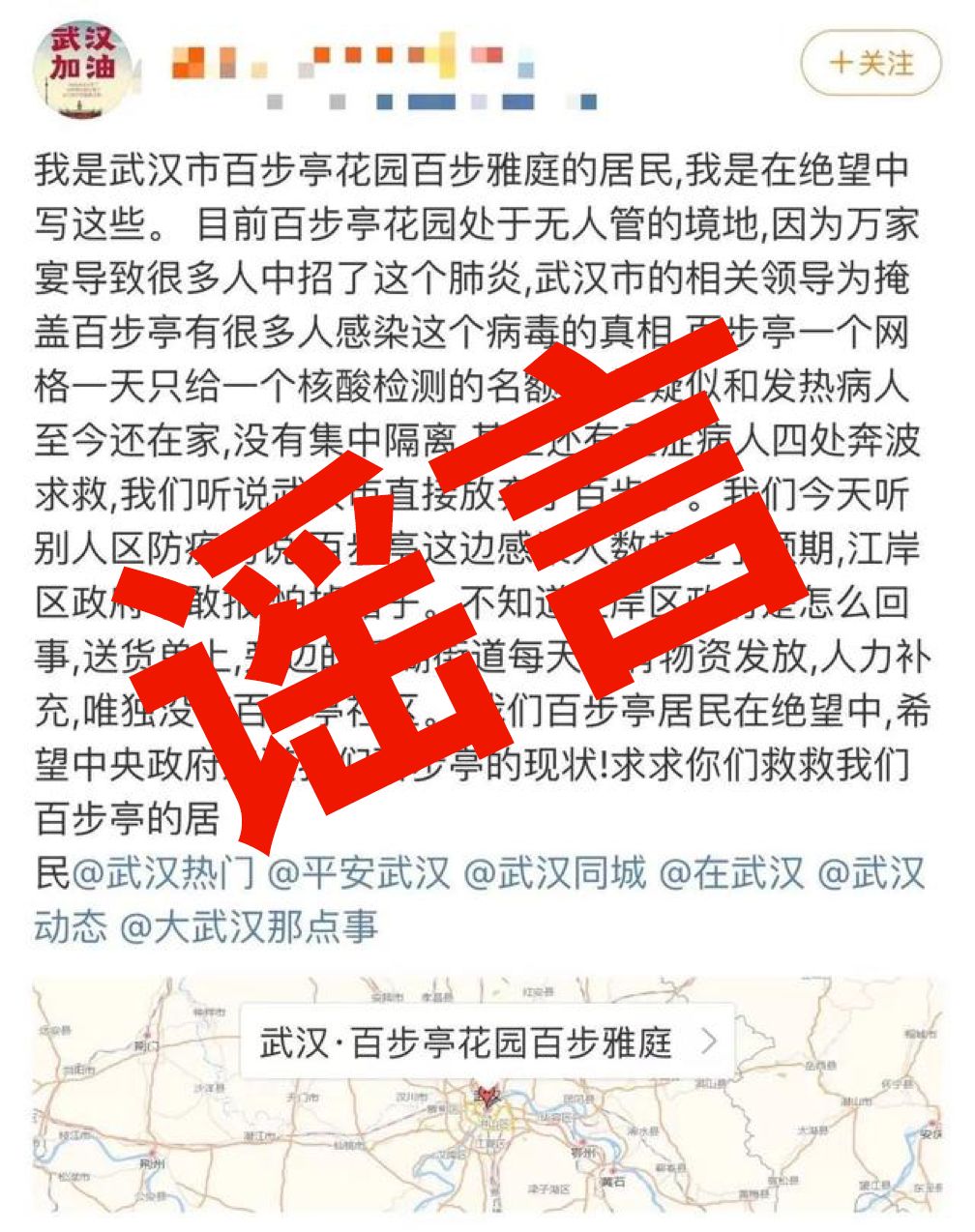 經武漢市防疫指揮部核查回覆:此為謠言。