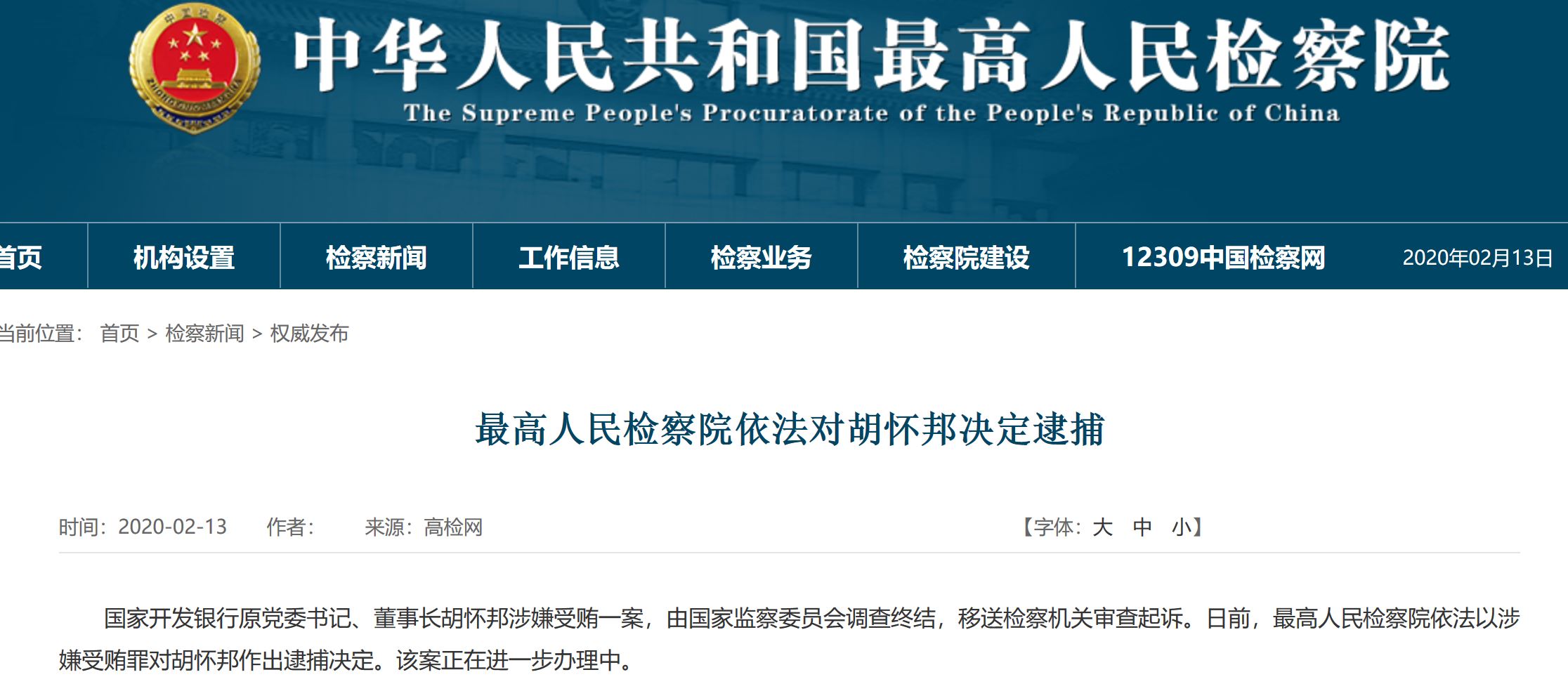 最高檢對國開行原黨委書記胡懷邦決定逮捕 2020-02-13 最高人民檢察院官網2月13日通報,國家開發銀行原黨委書記、董事長鬍懷邦涉嫌受賄一案,由國家監察委員會調查終結,移送檢察機關審查起訴。日前,最高人民檢察院依法以涉嫌受賄罪對胡懷邦作出逮捕決定。該案正在進一步辦理中。