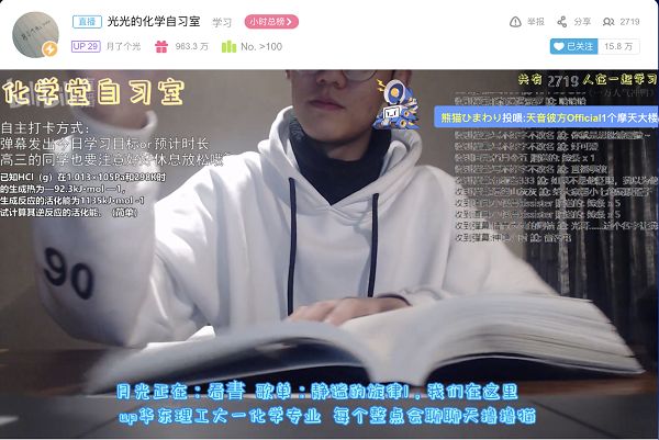 除了大師授課,和主播一起在線學習成為不少人每天堅持做的一件事。華東理工大學的厲亮同學就是往B站上傳音視頻的人,網名“月了個光”,初二那年,他開始頭一次學習直播,起初僅在週六開播,粉絲才幾十個,五年後,他的粉絲數已達15.8萬人。直播內容並不複雜,卻成為厲亮多年的習慣:晚上8點,架起攝像頭,挑一首舒緩的背景音樂,看看網課做做題,每個整點和“學友”互動。他坦言,這幾年學習的心態變化很大,開始只是被迫學習完成作業,進到大學後可以自主安排學習內容,不過這也對自身學習積極性有更大的挑戰。